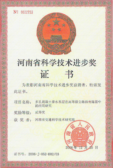 2006年多孔混凝土排水基层在高等级公路沥青路面中的应用研究二等奖